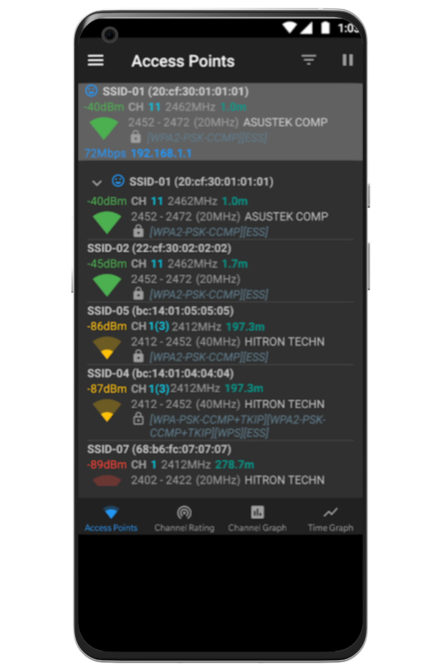 Both apps will display nearby WiFi SSIDs of all they can see in the vicinity. The value to read is the RSSI value measured in -dBm. The lower the figure the better, as it will have less interference value.